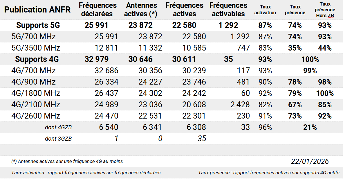 Au 1er janvier 2026, 82,4% des sites étaient équipés et 11,1% étaient susceptibles de bénéficier, en zone dense, de l'effet "intersite", soit ~93% des sites capables de distribuer un débit variant de 650-850 Mbps en intersite à 1,8 Gbps pour un site intégrant les technologies les plus performantes.