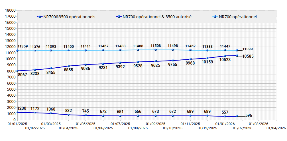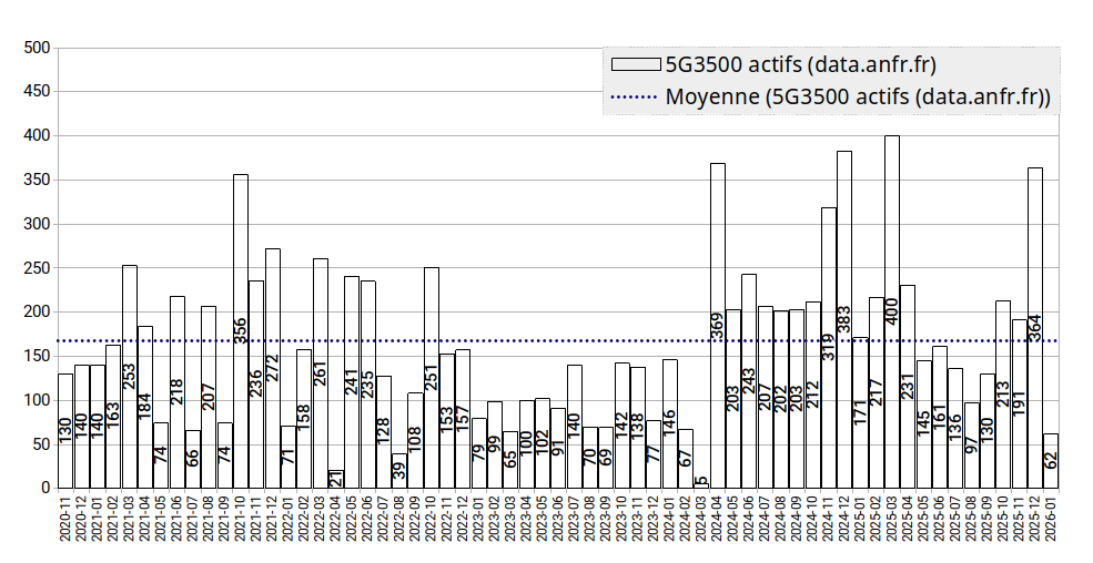 Les graphiques ci-dessus sont basés sur les fichiers ANFR publiés sur une base hebdomadaire et non sur la version papier. A titre indicatif, le dernier graphe établi à partir de la version papier publiée mensuellement figure ci-dessous :