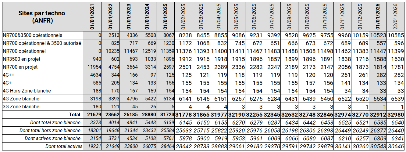 Courbe verte : Les 10500 sites à activer en 3500 MHz au 1er janvier 2026 représentaient 54,1% des sites actifs au 1er janvier 2023. Ils n'en représentent plus que 44,1% en raison de la politique active de déploiement de nouveaux sites (dont près d'un sur deux est équipé en 3500 MHz).